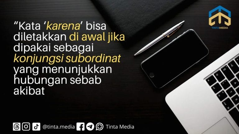 “Kata ‘karena’ bisa diletakkan di awal jika dipakai sebagai konjungsi subordinat yang menunjukkan hubungan sebab akibat. Contoh: Karena hujan, aku tidak masuk sekolah. Atau: Aku tidak masuk sekolah karena hujan. Tidak bisa ditulis: Aku tidak masuk sekolah. Karena hujan,” bebernya.