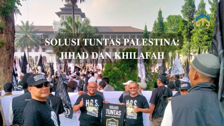 Tinta Media – Sebagaimana poster yang kami pegang, solusi tuntas masalah Palestina adalah jihad dan khilafah, bukan solusi dua negara. Jihad untuk mengenyahkan entitas penjajah Zionis Yahudi dari sana dan khilafah untuk memerdekakan secara hakiki negeri para anbiya. Karena akar masalahnya adalah perampasan tanah suci kaum Muslim ketiga oleh Zionis Yahudi yang disokong penuh oleh kafir penjajah Amerika Serikat, Inggris, Prancis, dan lainnya.